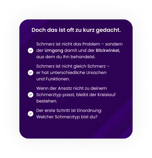Die 4 Schmerztypen sind dein Missing Link: Sie zeigen dir, was deinen Schmerz auslöst, warum er bleibt und welcher Ansatz für dich Sinn macht – damit du einen klaren roten Faden und den nächsten sinnvollen Schritt hast.