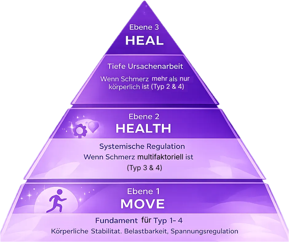 Weil wir nicht nach Schema F arbeiten. In Analyse & Plan ordnen wir deinen Schmerztyp ein, klären Trigger und Prioritäten – und entscheiden erst dann, ob MOVE oder HEAL/HEALTH für dich passt. So vermeidest du Fehlstarts und bekommst den richtigen nächsten Schritt.